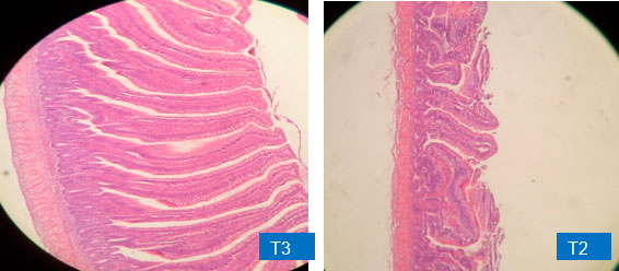 In duodenum, as well as in the other parts of the intestine (jejunum, ileum, ceca and colon), T3 batch (preservative as preventive) had less number of samples with lesions than batches T2 (infected non-treated) and T4 (preservative as treatment). Furthermore, lesions in batches treated with natural preservative where less severe than in T2 batch, because while T2 showed atrophy and necrosis, T3 and T4 batches had mild atrophy and mucus. Lesions found are described in the next pictures.