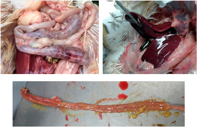 T2 batch (infected non-treated) had more animals that presented necrotic enteritis lesions, and these lesions were more severe than in other batches, including atrophy, necrosis and ulcers.