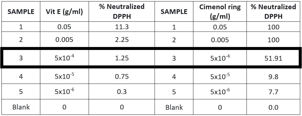 Results obtained at 0.05 g/ml and 0.005 g/ml can’t be compared because the 100% of DPPH is neutralized, which means there is too much antioxidant compound (cimenol) in the sample.