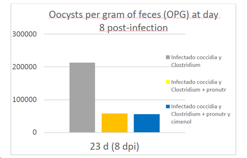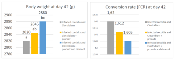 Regarding body weight, compared to an untreated batch infected with Clostridium and Eimeria, pronutrients achieved a clear improvement at day 42. This improvement was superior and statistically significant when, in addition to pronutrients, cimenol ring was supplemented, since each of the active principles fights Eimeria and Clostridium, respectively. The feed conversion rate was improved with a trend similar to the weight: the pronutrients batch improved this parameter, but the improvement was greater when cimenol ring was also supplemented, since besides to preventing coccidia with the use of pronutrients, a direct action on Clostridium is achieved with the cimenol ring.
